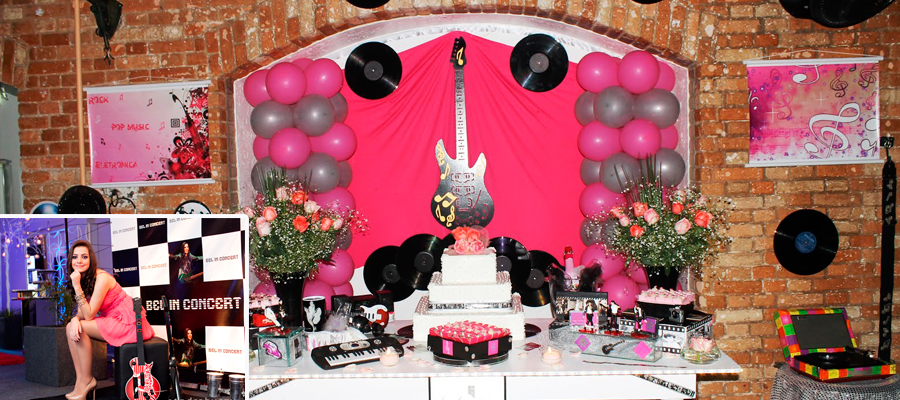 Abuse da mistura do rosa, preto e prata na decoração.Guitarras, caveiras e globos de luz ajudam a compor o clima rock’n’roll