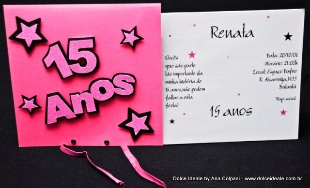 Para escolher o convite perfeito, você precisa já ter em mente qual será o estilo da sua festa.Se ela for temática, ele deve seguir esse tema. Se não,opte por modelos que tenham mais a ver com as cores escolhidas para a decoração. Mas tenha sempre em mente que o convite deve cumprir dois papéis importante: dar ao convidado informações essenciais (quem é a aniversariante, quando e onde será o evento) e definir o clima da festa,isto é, o grau de formalidade, para que as pessoas saibam se vestir no dia. Por exemplo: se você for fazer uma festa simples, nada de preparar um convite cheio de fru-frus, e vice-versa. E se a sua festa de 15 anos for temática, escreva no convite de que modo os convidados deverão se vestir.
