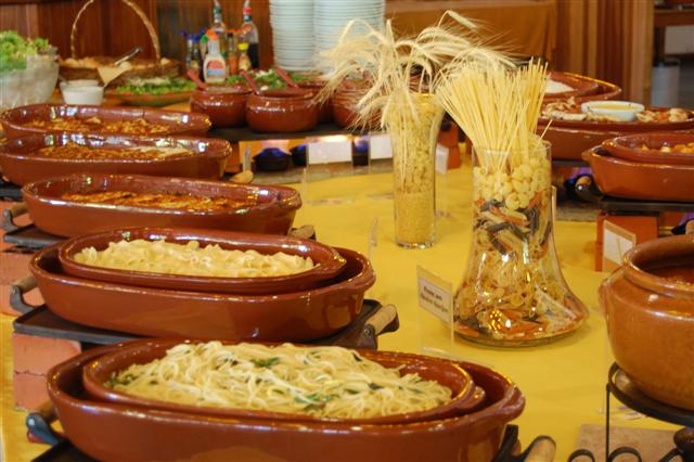 Espalhar ilhas pelo salão servindo massas variadas a noite toda também é uma boa opção para quem vai fazer a festa á noite. As massas podem ser servidas em cumbucas, daí não há necessidade de comer sentado.